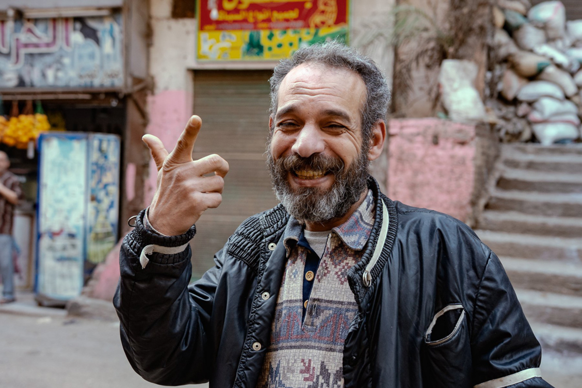 Das Bild zeigt einen älteren Mann mit einem langen, grauen Bart, der lächelnd die ‘Peace’-Geste macht. Er trägt eine schwarze Lederjacke und ein bunt gemustertes Hemd. Im Hintergrund sind Mülltonnen, Geschäfte und Graffiti zu sehen. Die Szene spielt sich in Kairo, Ägypten ab.