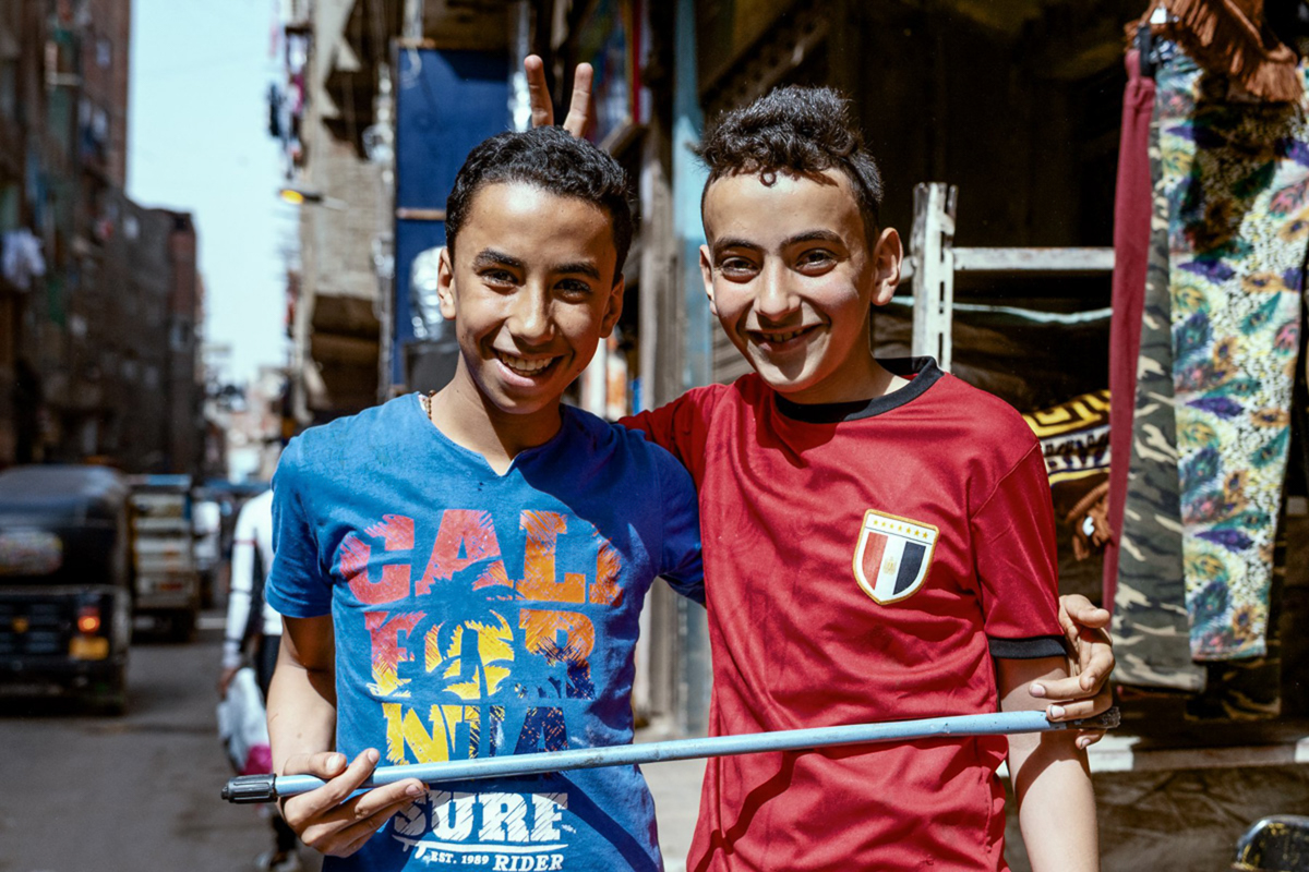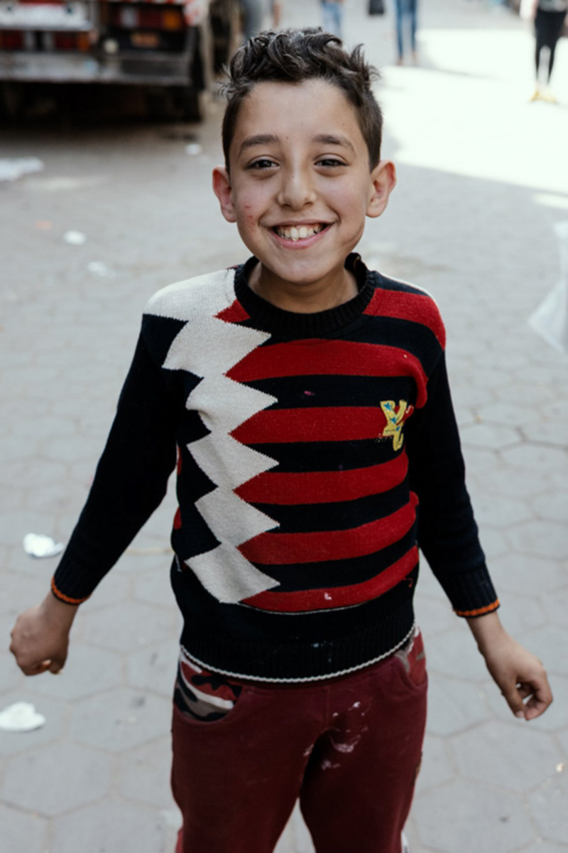 Das Bild zeigt ein Kind, das lächelnd in die Kamera schaut. Er trägt einen gestreiften, langen Pullover mit einem kleinen, weißen Emblem und rote Hosen. Die Umgebung ist eine belebte Straße in Kairo, Ägypten. Die Stimmung ist freundlich und unschuldig.