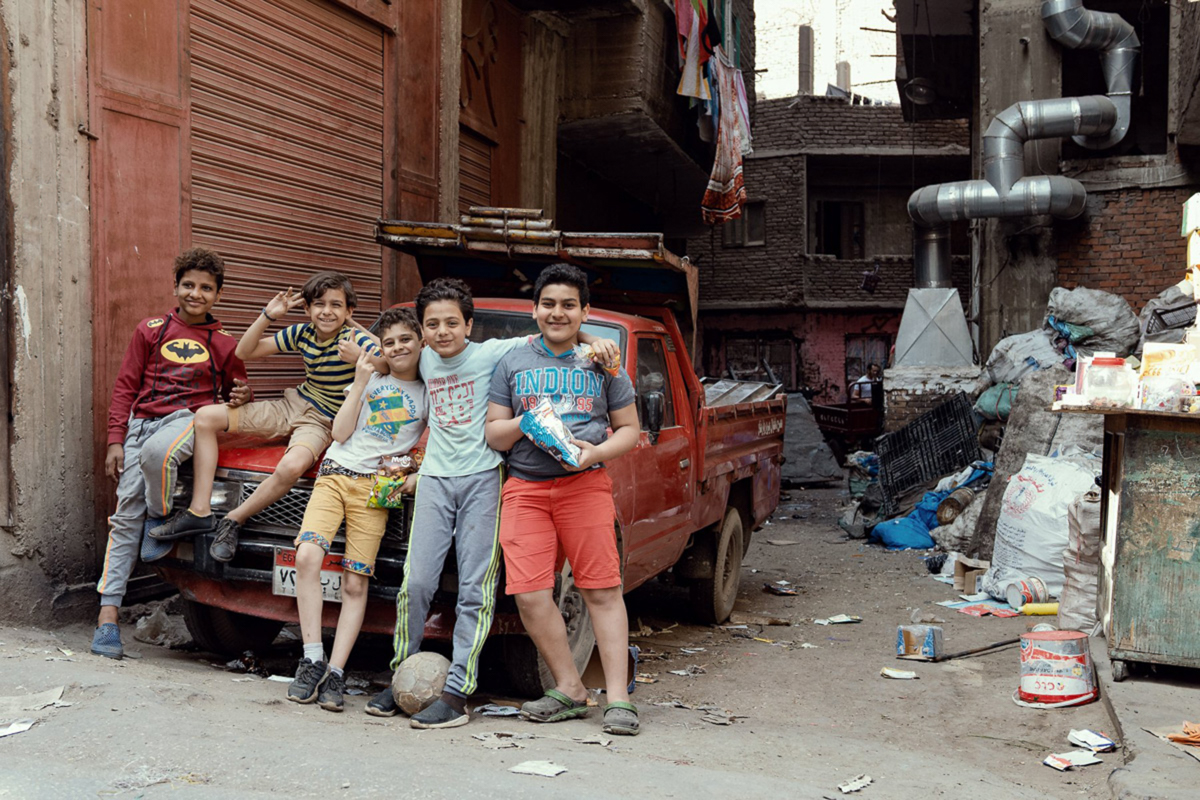 Das Bild zeigt eine Gruppe von Knaben, die auf einem rostigen, roten Pickup-Truck in einer überfüllten, staubigen Gasse in Kairo, Ägypten, posieren. Die Szene vermittelt einen Eindruck des täglichen Lebens in einem ägyptischen Slum, vermutlich in der Nähe des Zabaleen-Bereichs.