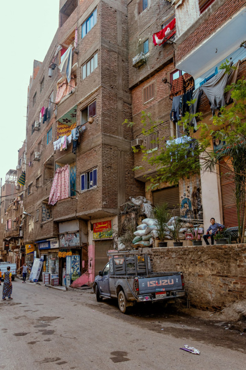 Das Bild zeigt eine lebendige Straßenszene in Kairo, Ägypten. Im Vordergrund befindet sich ein grauer Isuzu-LKW (wahrscheinlich ein D-Max Modell) mit Sand auf dem Ladefläche. Im Hintergrund erstrecken sich mehrgeschossige Gebäude, an denen eine Vielzahl von Wäschestücke aufgehängt sind. Einige Gebäude sind mit kleinen Geschäften oder Verkaufsständen versehen. Im Vordergrund sind einige Personen zu sehen, die sich auf der Straße aufhalten. Die Szene vermittelt einen Eindruck des Alltagslebens in einem ägyptischen Viertel.
