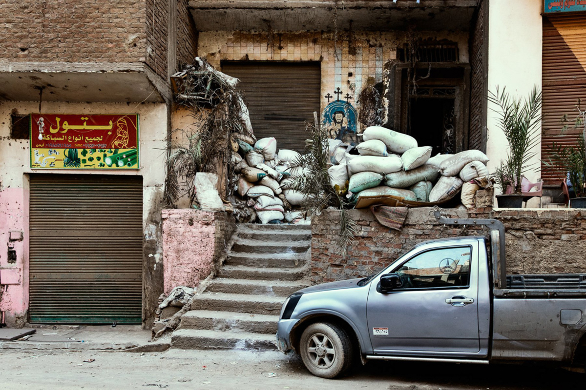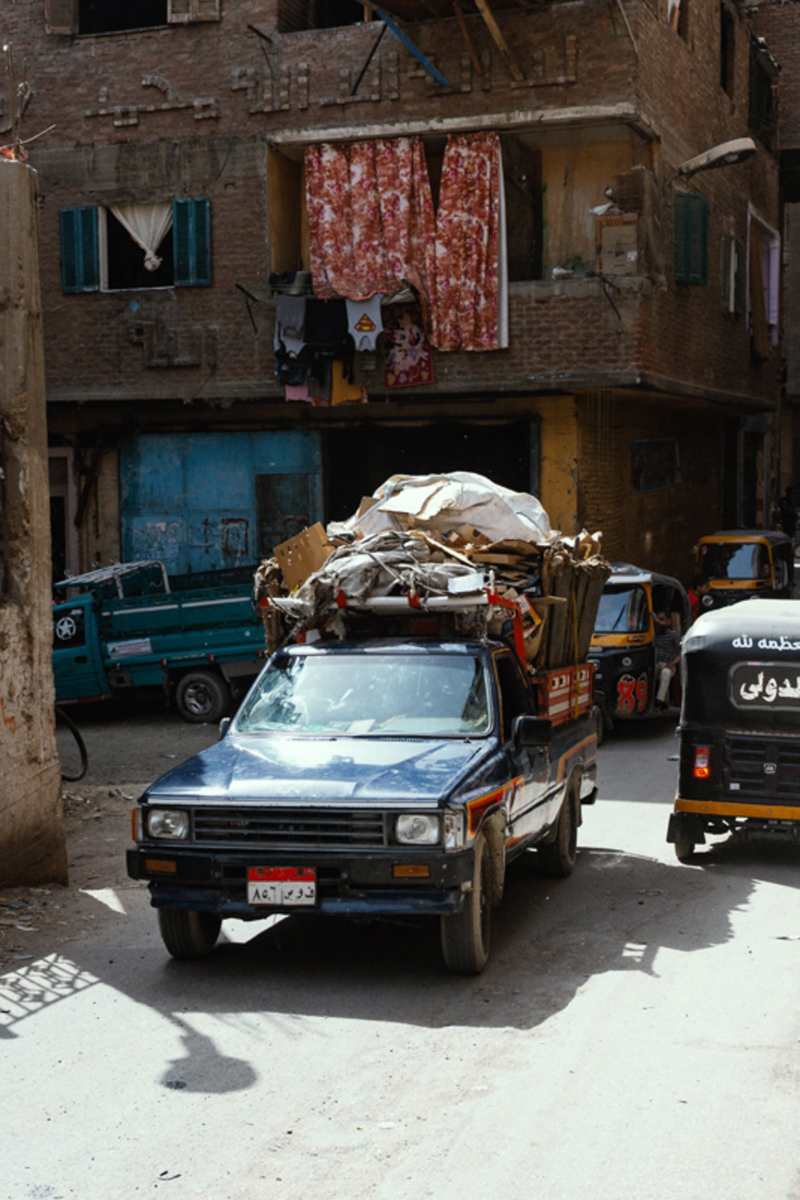 Die Aufnahme zeigt eine Szene in einem ägyptischen Viertel, wahrscheinlich in Kairo, die das Leben der Zabaleen, die Müllsammler, darstellt. Ein grauer Pickup-Truck steht vor einer schiefen Mauer, auf der Säcke mit Müll gestapelt sind. Die Umgebung ist von Schmutz, Graffiti und heruntergekommenen Gebäuden geprägt. Die Szene vermittelt ein Bild von Armut und der alltäglichen Realität des Lebens in einer ägyptischen Großstadt.