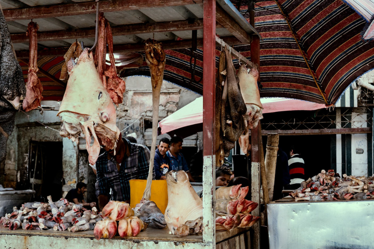 Das Bild zeigt einen Marktstand in Kairo, Ägypten, auf dem Fleisch aufgehängt ist. Der Stand ist von einem farbenprächtigen, traditionellen Dachüberdachung geschützt. Im Hintergrund sind weitere Personen zu sehen, die den Markt frequentieren. Die Szene vermittelt einen Eindruck des Alltagslebens in dieser Gegend.