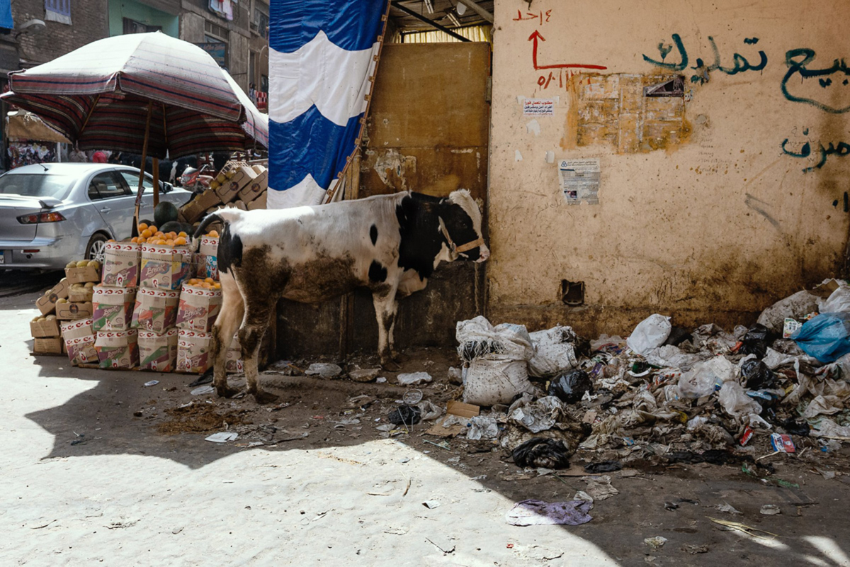 Reportagefotografie Berlin Das Bild zeigt eine weiße Kuh, die vor einem Müllcontainer in einer belebten Straße in Kairo steht. Im Hintergrund sind weitere Müllcontainer, eine Asphaltstraße und ein gelb-braunes Gebäude zu sehen. Eine Person, vermutlich ein Zabaleen (Müllsammler), steht im Hintergrund und scheint die Kuh zu beobachten. Die Szene ist von einer lebhaften, urbanen Atmosphäre geprägt, typisch für die Zabaleen-Gemeinschaft in Kairo.