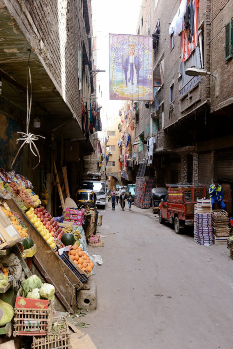Die Szene ist dynamisch und lärmhaft. Eine schmale Gasse, die von Mehrgeschosswohngebäuden gesäumt ist, bildet den Hintergrund. Auf der linken Seite befindet sich ein Markt mit Regalen, die mit Obst, Gemüse und Konserven gefüllt sind. Ein Roter Lastwagen, vermutlich ein Mercedes-Benz, steht am Straßenrand. Im Hintergrund sind Zabaleen, die Müllsammler, zu sehen, die ihre Arbeit verrichten. Die Gasse ist mit Werbetafeln und Textilien gesäumt. Im Vordergrund sind Fußgänger zu erkennen, die den Markt auf der Suche nach Waren oder einem Gespräch durchqueren. Die Szene ist von einer dichten Atmosphäre geprägt, die durch den Lärm, die Menschenmassen und die Vielfalt der Waren und Personen entsteht.